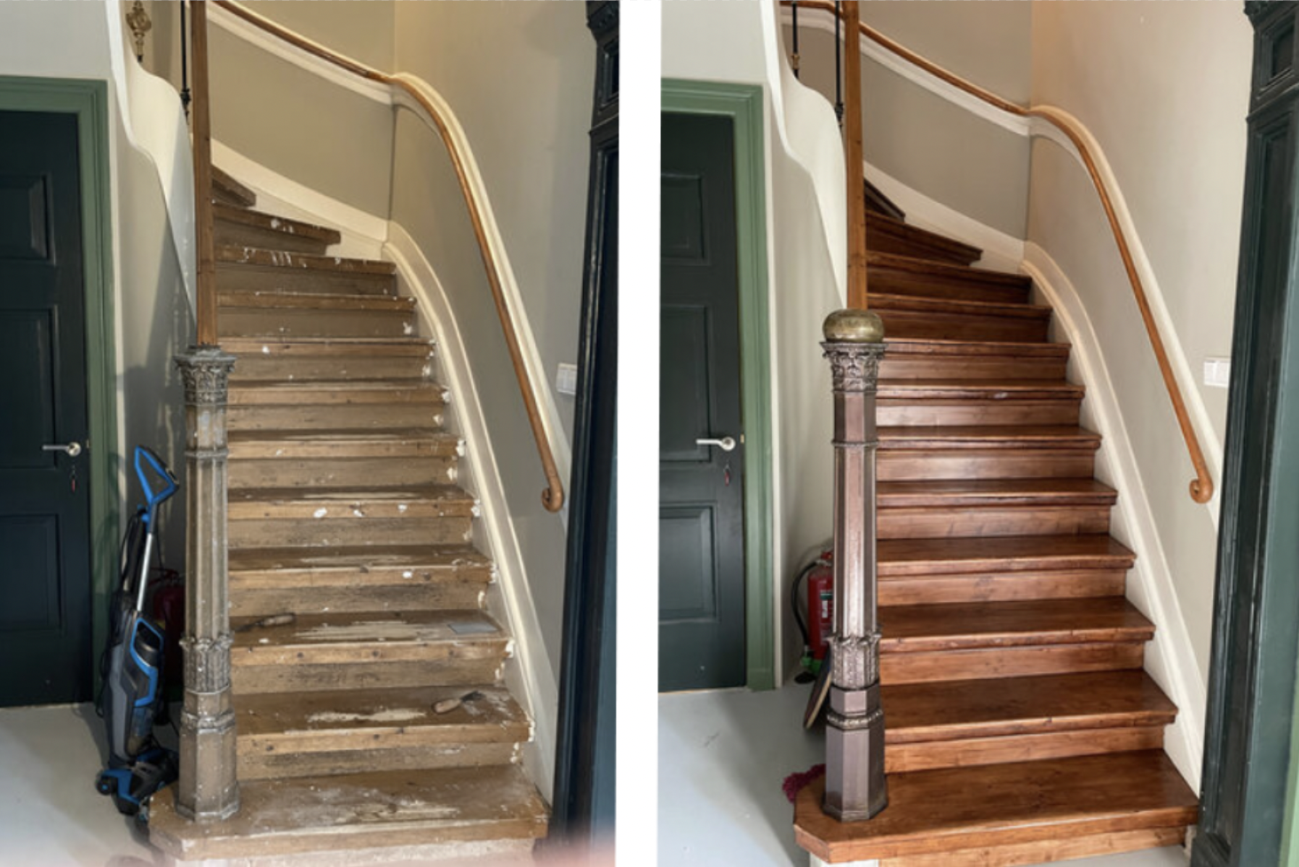 Een 19de eeuwse trap gerenoveerd; stootborden geplaatst, profielen vernieuwd, gebeitst en gelakt. Een mooi resultaat!